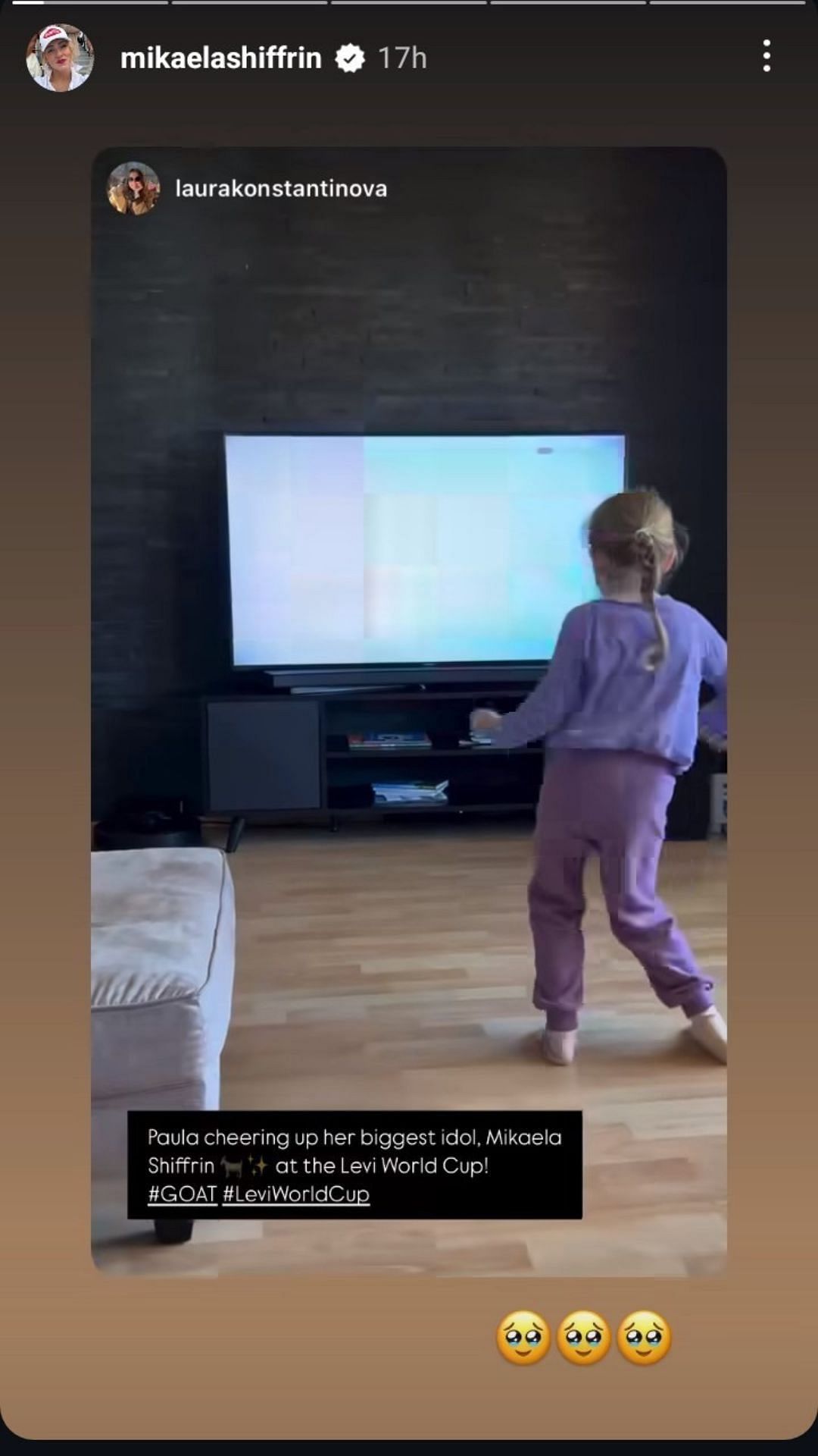 While the American was busy competing in Finland, she had a young fan cheering her on from home. An Instagram story of the fan rooting for the skier read 'Paula cheering up her biggest idol, Mikaela Shiffrin, at the Levi World Cup'. Shiffrin reposted the story and added three watery eyes emojis in response to her adorable supporter.