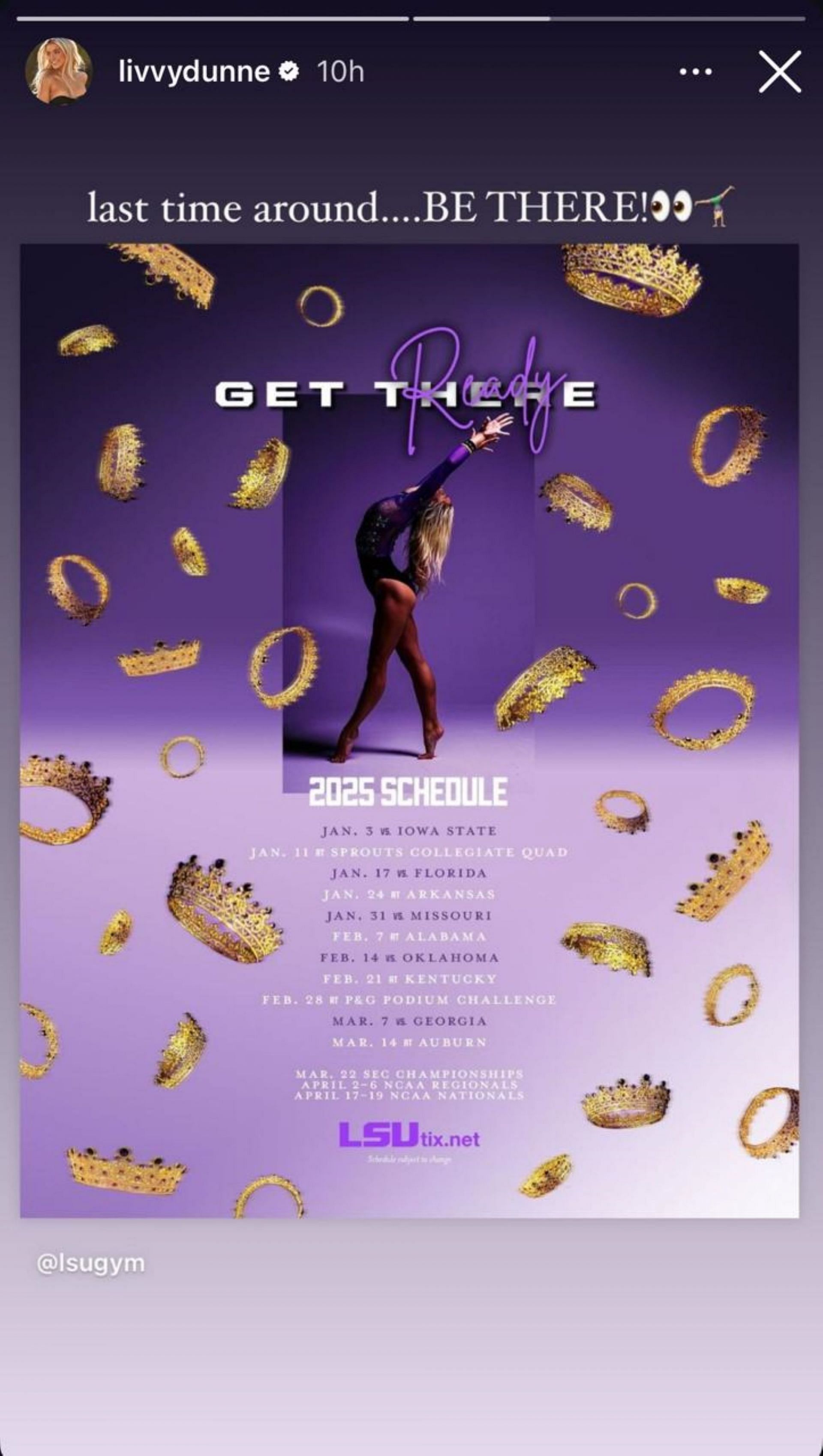 Olivia Dunne shared LSU's 2025 NCAA season schedule, starting January next year, and requested her fans to tune in to watch her for the last time at LSU. Dunne was part of the title-winning team at the 2024 NCAA Championships and returned to her alma mater for fifth-year eligibility.
