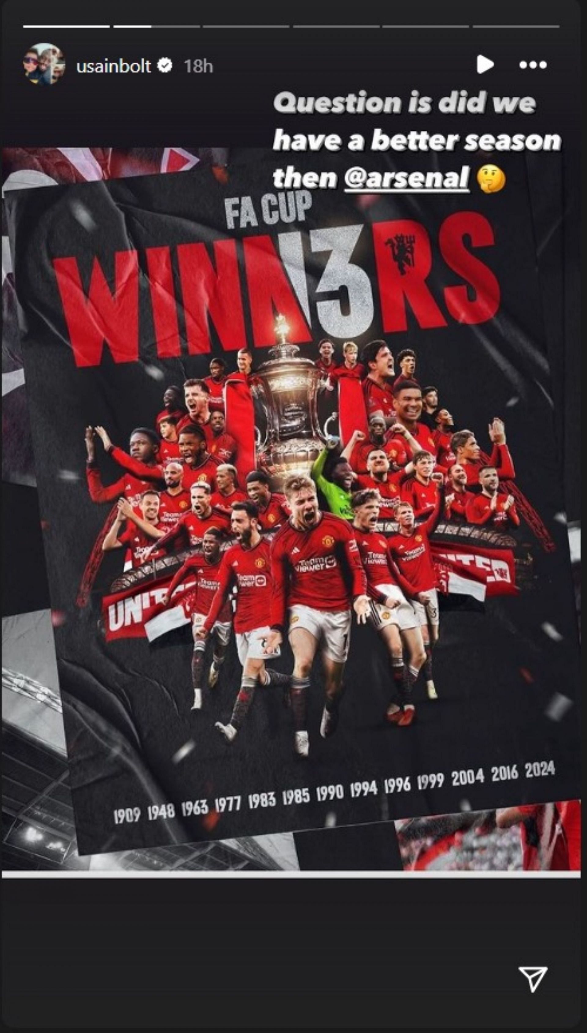 The eight-time Olympic champion has expressed his love for Manchester United quite a few times, and when the men in red secured the Cup, Bolt could not contain his excitement. He shared a post on his Instagram stories celebrating their win and asking an intriguing question. He wrote: