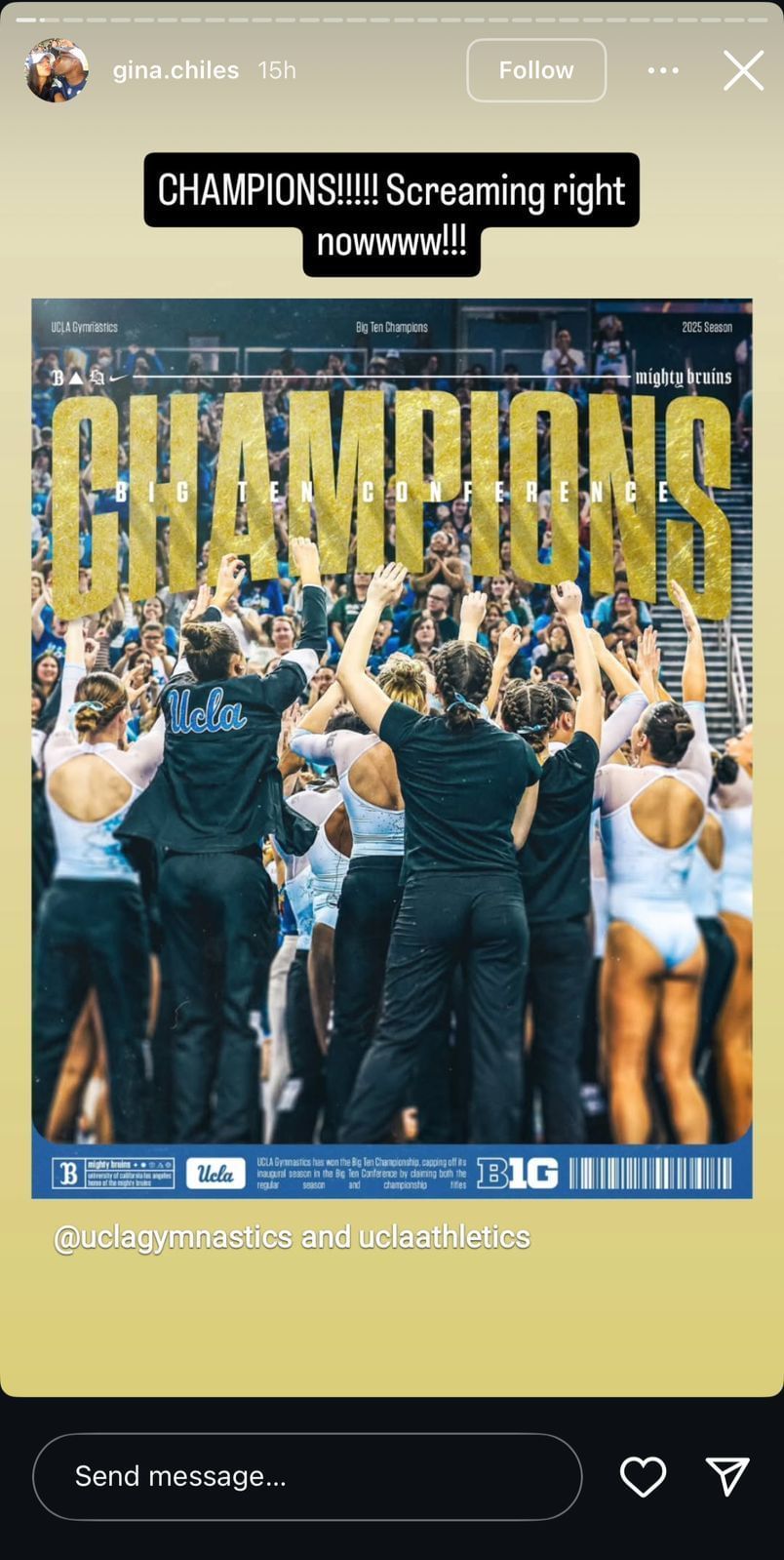 Olympic gymnast Jordan Chiles' mother shared her reaction to the UCLA Bruins winning the Big Ten Championship for the first time. The Bruins have won the conference title in their first-ever appearance at the conference championships. After Jordan and the Bruins secured their title, Gina Chiles shared her reaction to the title win on Instagram.