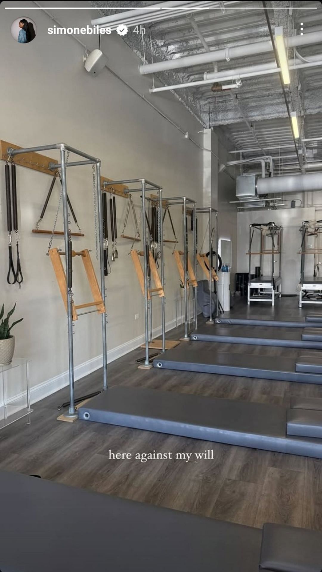 Now, after returning home from her vacation, Simone Biles is back to working out. On Sunday (January 26), the 27-year-old took to her Instagram story to share a photo of a pilates studio, writing,