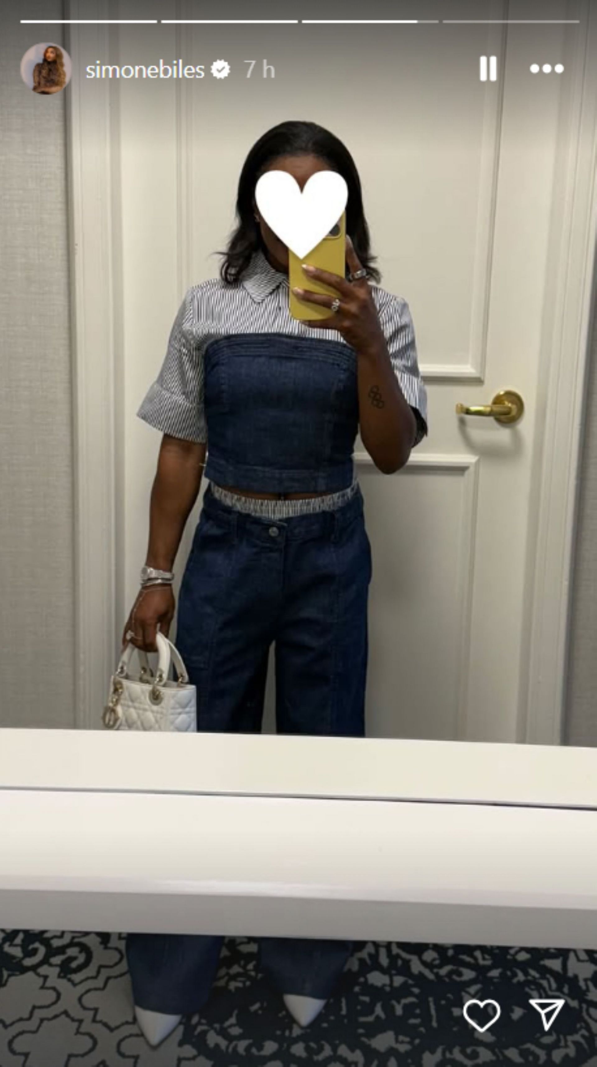 Biles's previous story featured her in a denim outfit over a cotton mid-sleeved shirt. She flaunted silver accessories and complimented the look with a white quilted bag.