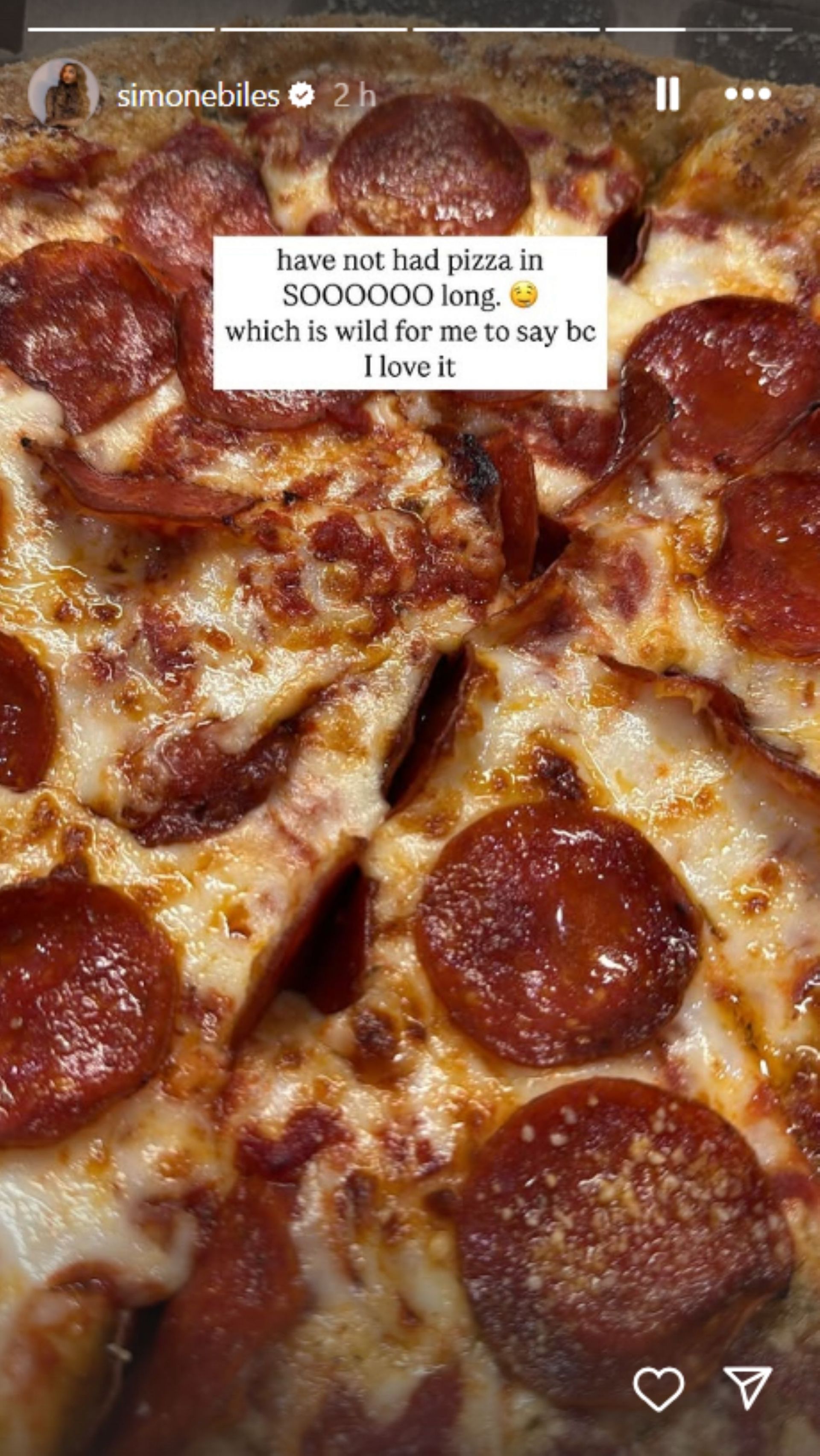 Simone Biles indulged in a pepperoni pizza and expressed that she hadn't eaten the dish in a long time. She has been sharing off-mats updates since concluding the Gold Over America tour later in 2024.