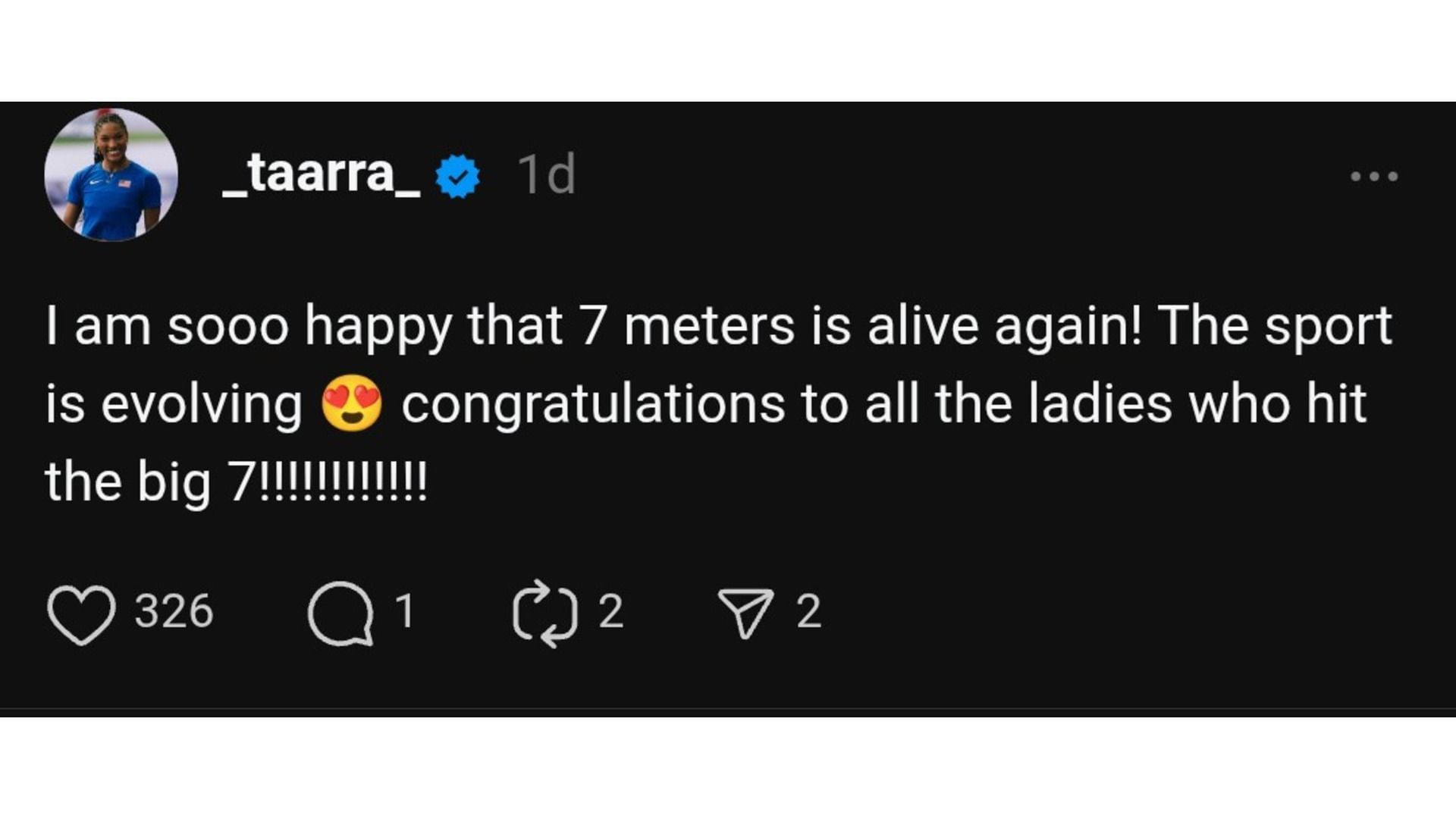"I am sooo happy that 7 meters is alive again! The sport is evolving 😍 congratulations to all the ladies who hit the big 7!!!!!!!!!!!!"
