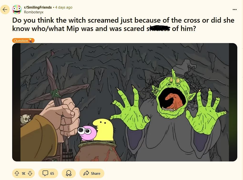 Another fan did, however, speculate that the witch truly was terrified of Mip's cross rather than Mip himself: