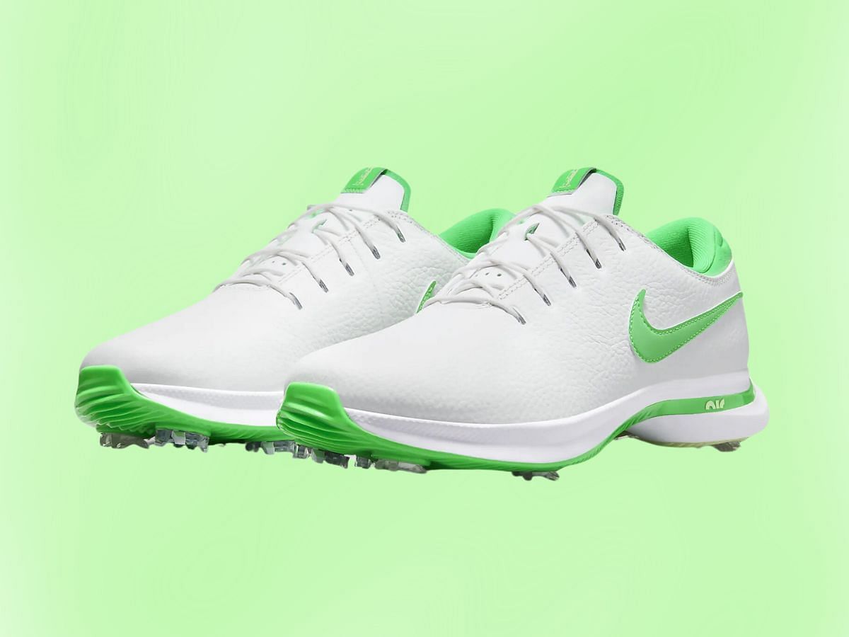 Nike describes the new spike system on the golf shoes as offering exceptional traction from tee to green. This pair comes in a summit white, white, barely volt, and shock green colorway.