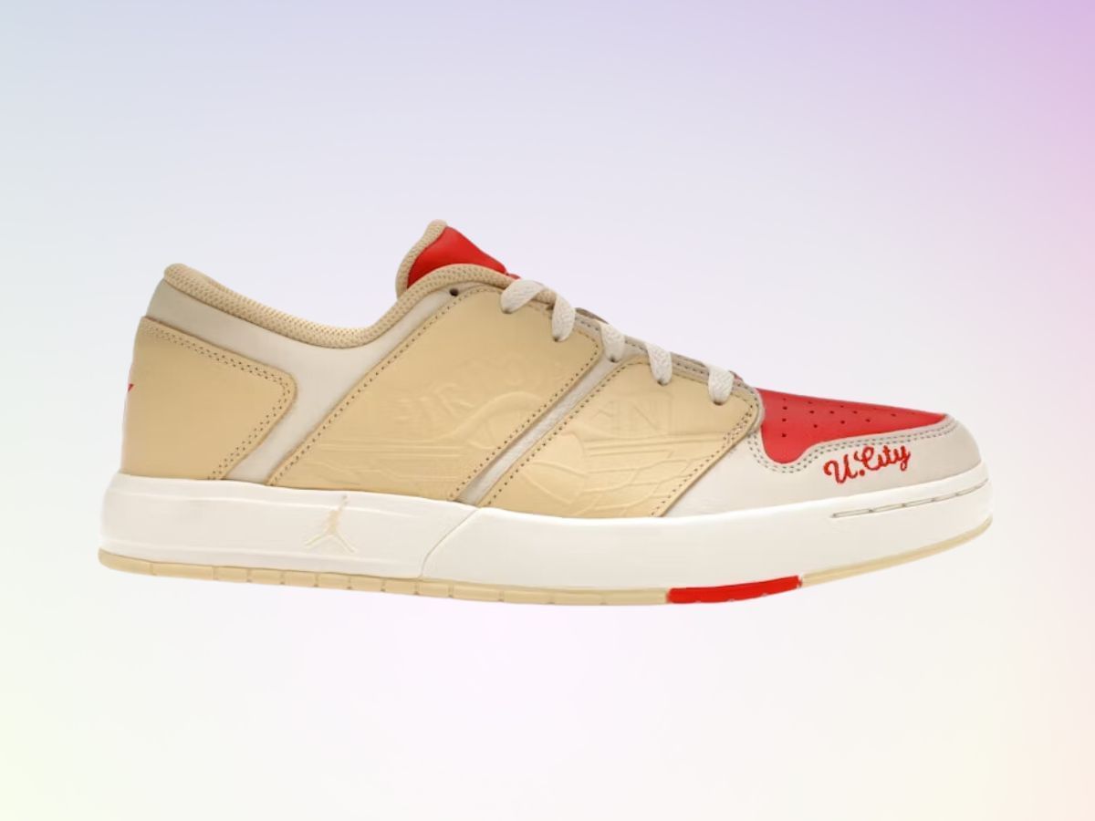 More details include the 'AIR' lettering on the side and the 'U. CITY ' text printed on the front in red hue on the grey leather upper.