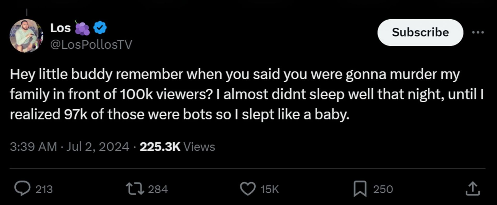 "Hey, little buddy remember when you said you were gonna murder my family in front of 100k viewers? I almost didn't sleep well that night, until I realized 97k of those were bots so I slept like a baby."