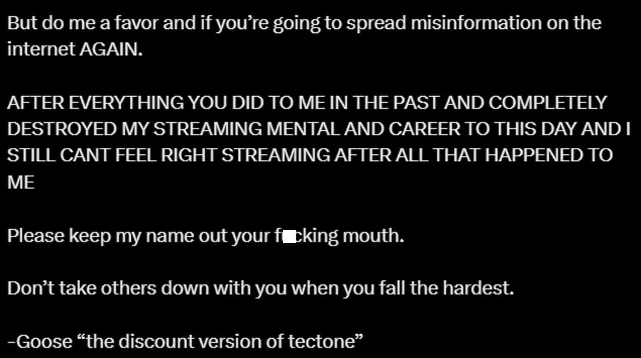 "To GooseEgg, we talked and called in private and I thought we had cleared things up. I have since found out you’ve gone behind my back and been talking shit about me to Tectone and allowing him to spin a completely different narrative to what you told me."