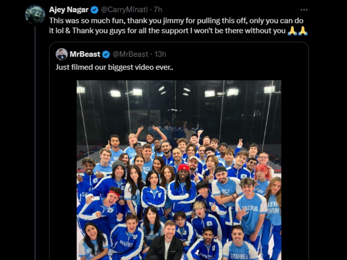 YouTube star Jimmy "MrBeast" has been in a celebratory mood of late after claiming the title of the most subscribed YouTube channel, surpassing T-Series. The streamer even shared a banter-worthy comment on Ajey Nagar aka CarryMinati's X.com post about their recent collaboration. The Indian YouTuber reflected on their upcoming video and said: