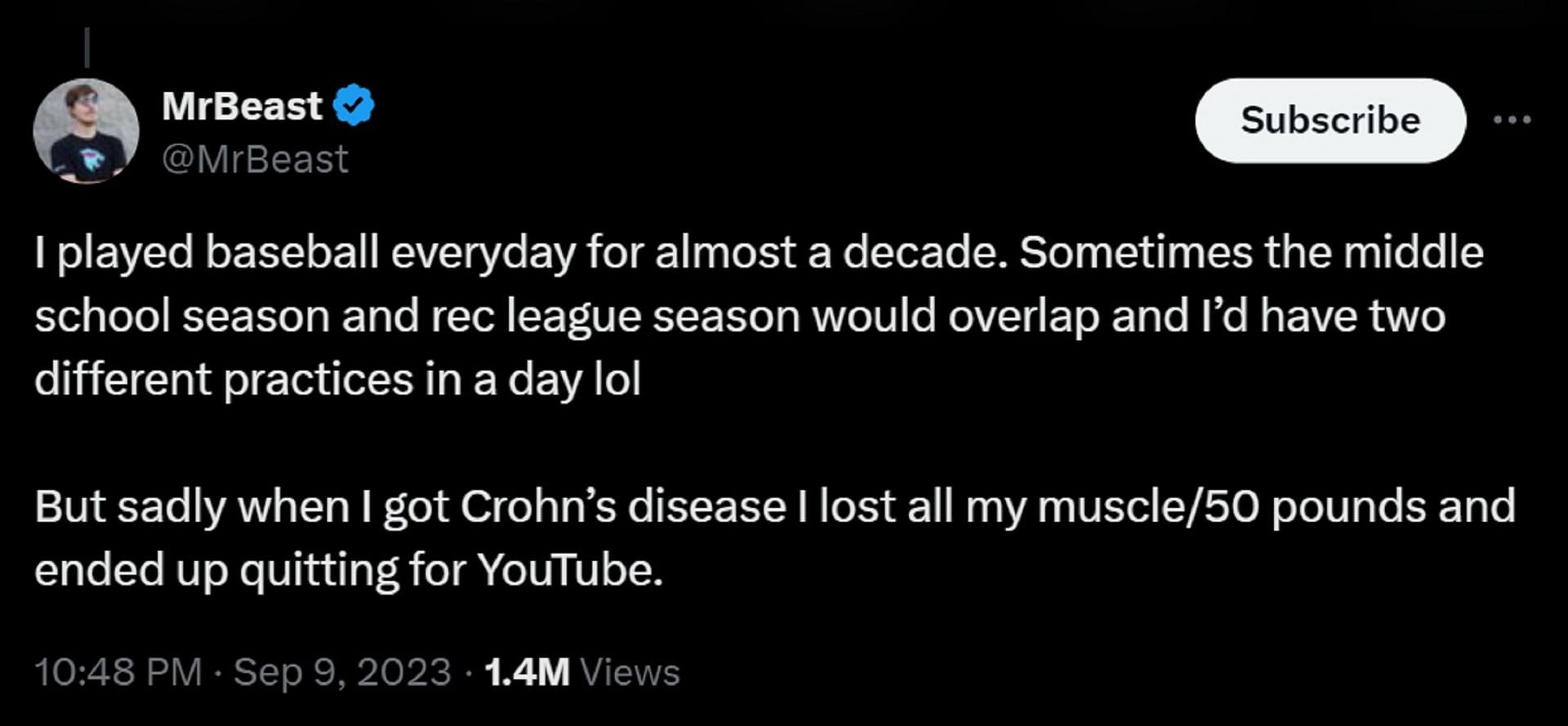 He has also spoken about the disease on his YouTube channel. In a video titled What Is Crohn's Disease????? (August 10, 2015), MrBeast said: