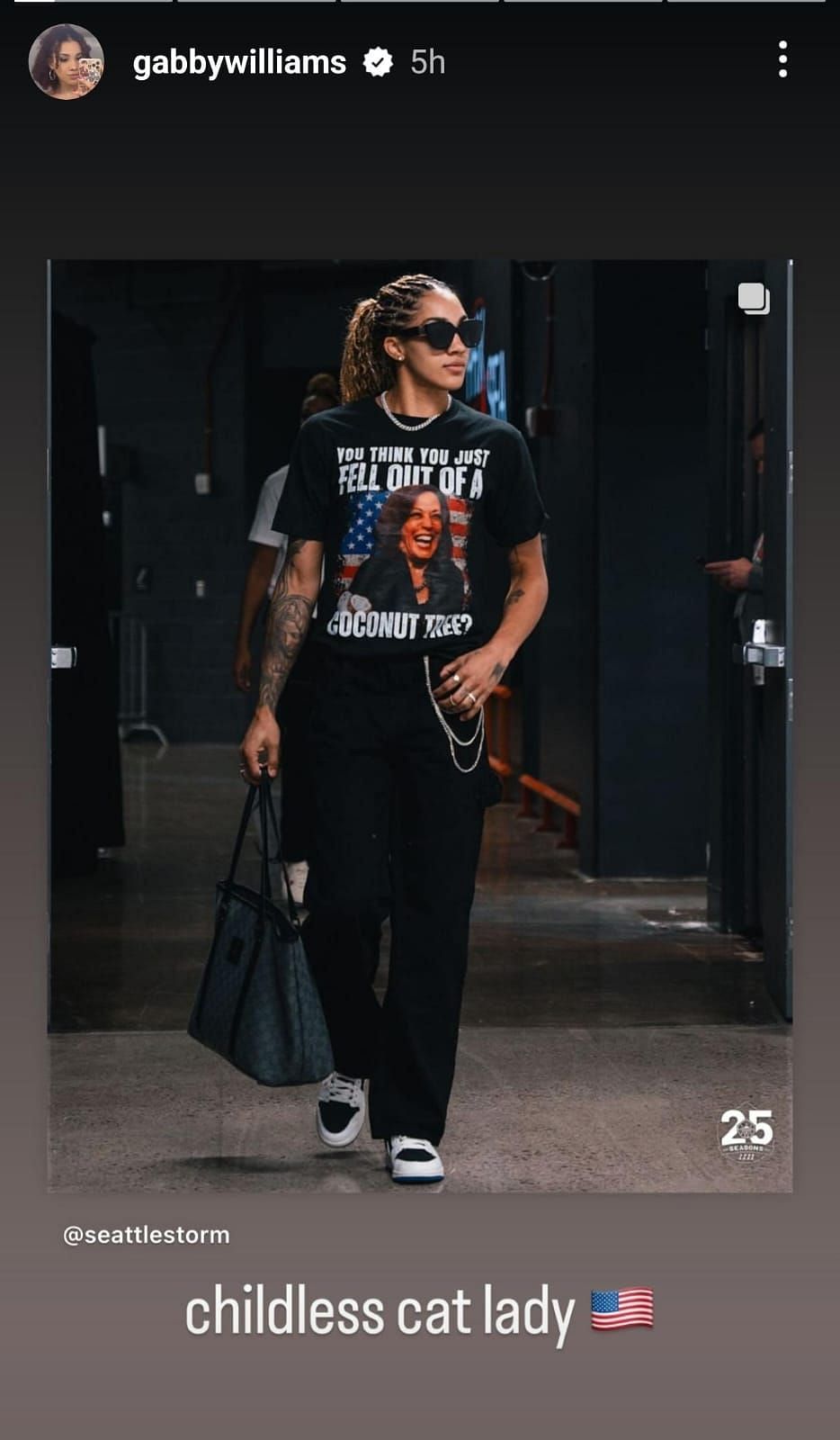On Thursday, Williams re-posted a photo the Seattle Storm put up of her pregame attire. In the image, she is donning a Kamala Harris T-shirt and captioned it with the phrase "childless cat lady." This was in reference to the Instagram post pop star Taylor Swift made last week while endorsing the U.S. Vice President.