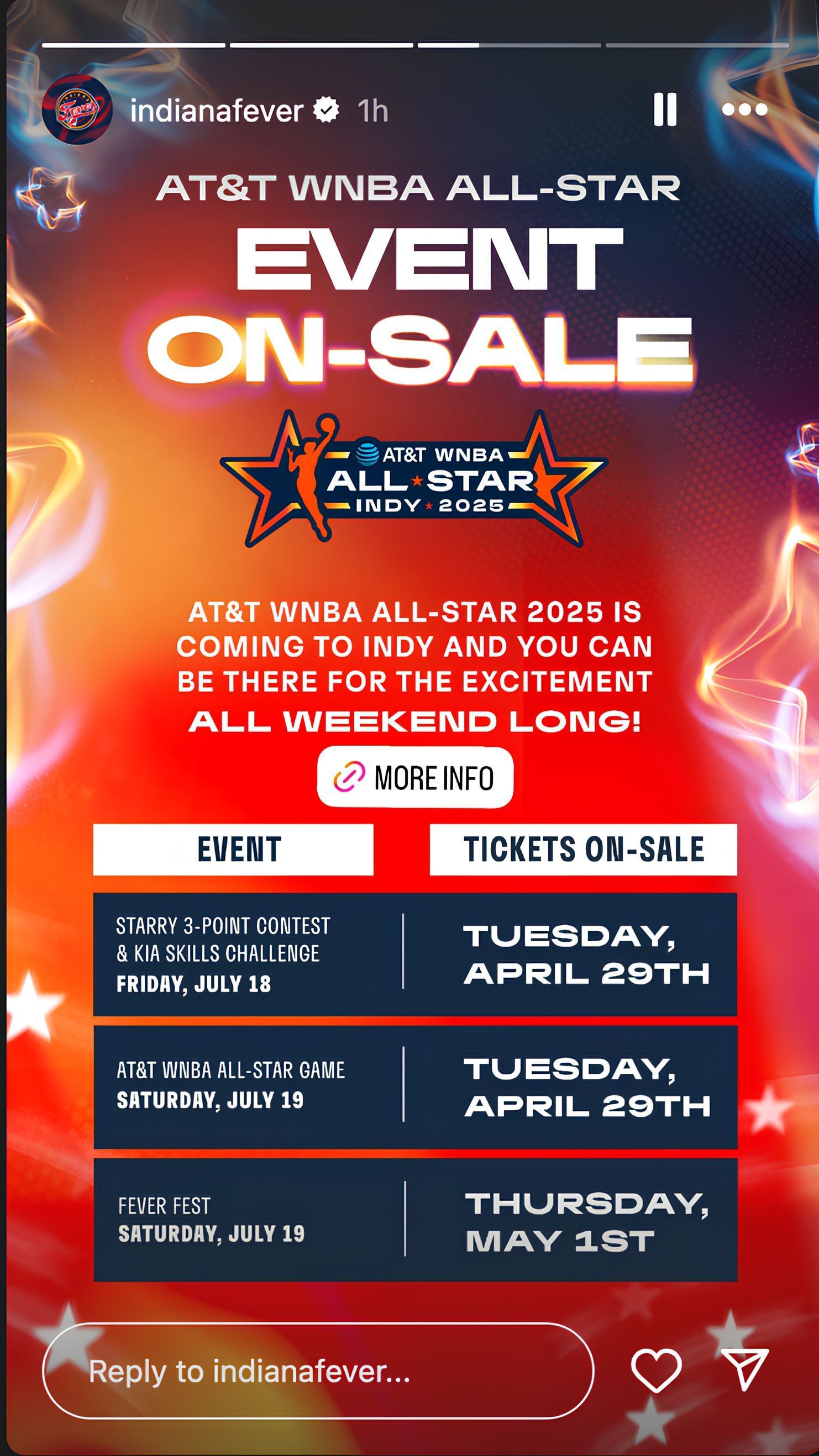 For those potentially eyeing attending All-Star weekend in Indiana, tickets will go on sale in the coming weeks. On Thursday morning, the Fever broke down how fans secure entry into the action. Tickets to the three-point contest, skills challenge and the All-Star will be available for purchase on April 29th. Then, on May 1st, fans can purchase tickets to "Fever Fest" that will conclude the jam-packed weekend.