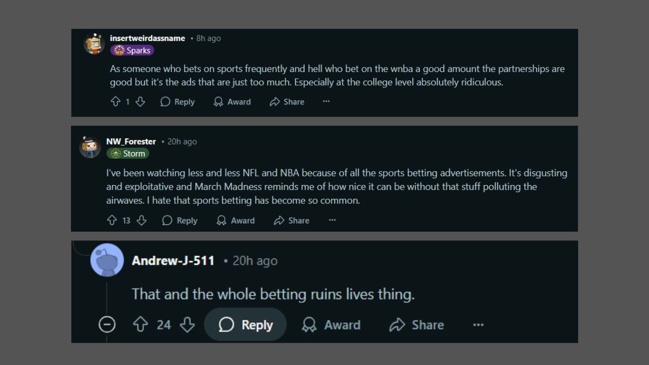 "I've been watching less and less NFL and NBA because of all the sports betting advertisements. It's disgusting and exploitative and March Madness reminds me of how nice it can be without that stuff polluting the airwaves. I hate that sports betting has become so common," a fan wrote.