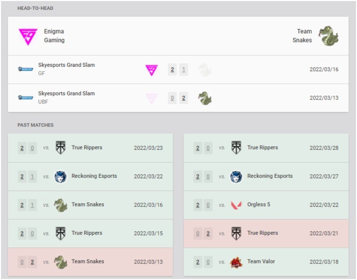 Both teams have won four of their last five games in all competitions. However, the only defeat faced by Enigma Gaming in its recent games was against Team Snakes itself.