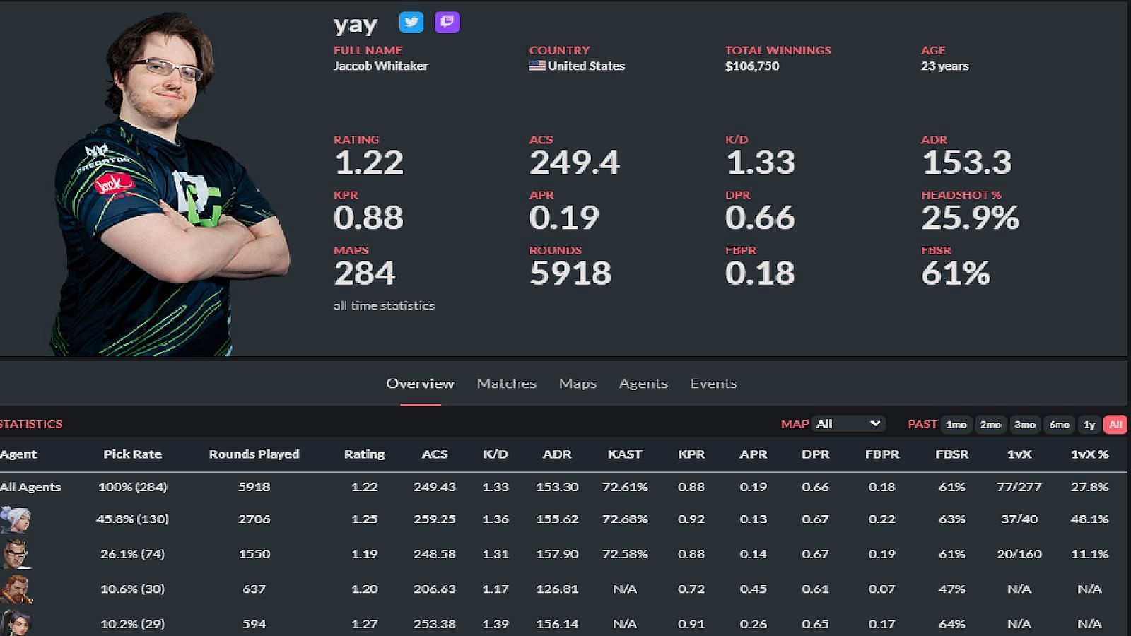 Turning impossible rounds into favorable ones for OpTic Gaming, Yay has become a globally loved and respected Valorant player. With an insane ACS of 250 and an FBSR of 61%, Yay is not someone you want to see on the other side of the map.