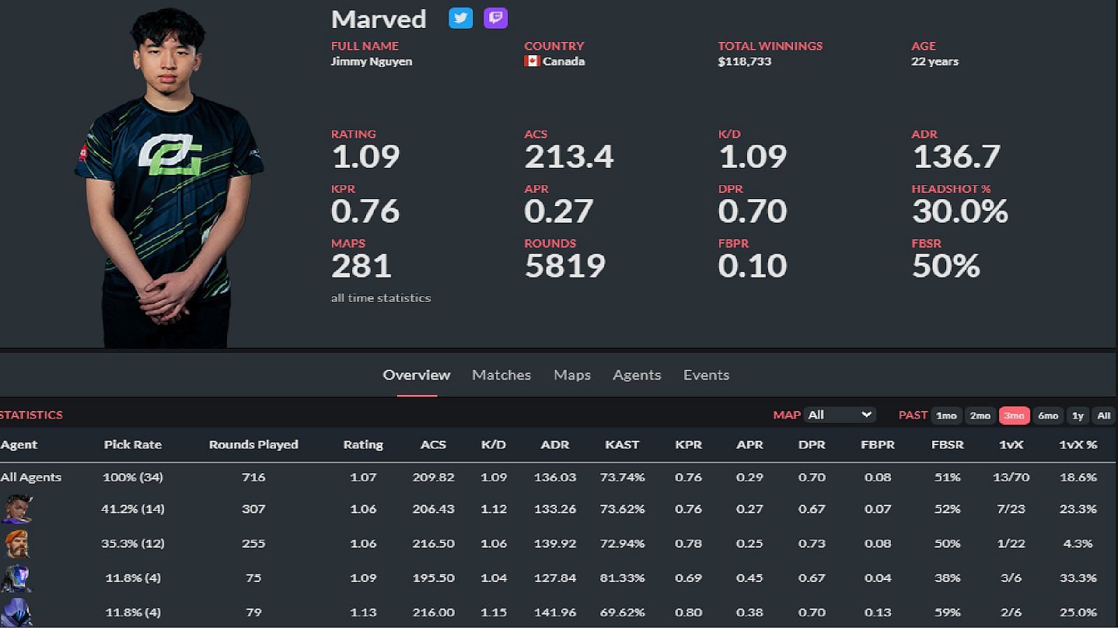 Marved is best known for his role as the Controller player of OpTic Gaming. Exceptionally skilled in using his Agent utilities, Marved can create a clear path for the execution of strategies. He has mastered the method of showing his presence on the entire map while still aiding his team.