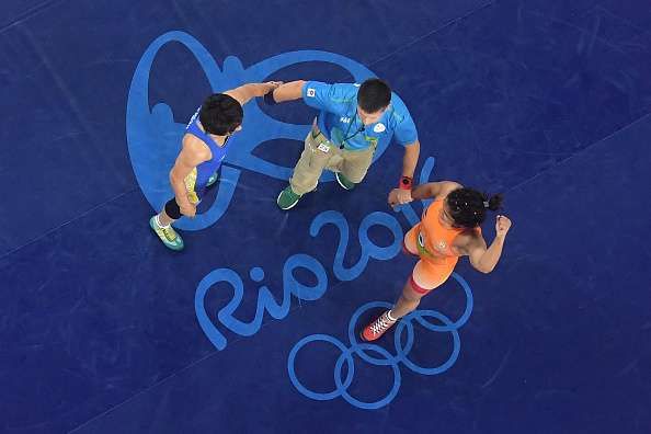 RIO DE JANEIRO, BRAZIL - AUGUST 17:  Sakshi Malik of India is declared the winner against Aisuluu Tynybekova of Kyrgyzstan during the Women's Freestyle 58 kg Bronze match on Day 12 of the Rio 2016 Olympic Games at Caioca Arena 2 on August 17, 2016 in Rio de Janeiro, Brazil.  (Photo by Lars Baron/Getty Images)
