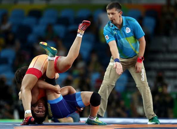 RIO DE JANEIRO, BRAZIL - AUGUST 17:  Sakshi Malik (bottom) of India competes against Valeriia Koblova Zholobova of Russia during a Women's Freestyle 58kg Quarterfinal bout on Day 12 of the Rio 2016 Olympic Games at Caioca Arena 2 on August 17, 2016 in Rio de Janeiro, Brazil.  (Photo by Lars Baron/Getty Images)