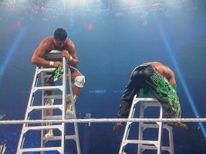 Before the match began, Josh Mathews interviewed Mr. McMahon on the CM Punk contract issue. The Chief of Talent Relations of the WWE, Johnny Ace was present with him. Vince McMahon confirmed that CM Punk had not sign the contract and it was his decision taking into account that he offered a very lucrative deal with all the need of Punk being satisfied. He also sent out warning to John Cena saying that he is the one to blame for all of this. This was a good segment and a nice way to add more drama into the burning issue. Some hardcore wrestling fans thought the situation in Montreal 1997 was also similar with Patterson and Brisco being present in Montreal. They say that their roles were reprised by Johnny Ace and a Lawyer. Strange comparison!We go back to the ring where Alberto Del Rio makes the first entrance. Then come Kofi Kingston, Jack Swagger, Evan Bourne, Alex Riley, R-Truth, The Miz and finally Rey Mysterio. There were pretty loud cheers for The Miz as well as R-Truth when they made their entrances. Everyone grabbed a ladder each and the match begun. Alberto Del Rio was the first to bear the brunt of his past as he was attacked by everyone and got buried under a pile of ladders outside the ring. There were plenty of dives especially from Mysterio and Kingston. Evan Bourne did a shooting star press from the top of a ladder outside the ring to ground all 7 other men.