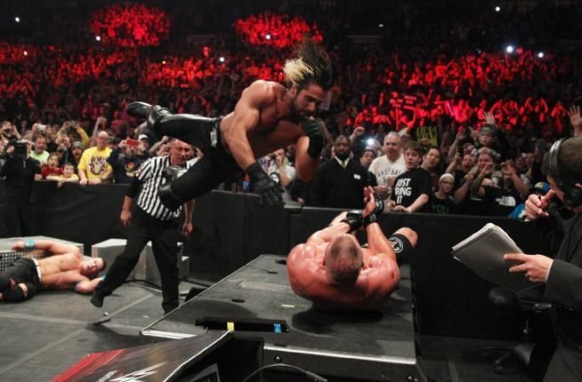 What did lay him out was Rollins delivering an elbow drop on the table, eliminating Lesnar from the fold and causing him to be stretchered away. Lesnar didn't allow that to happen, came back and eventually pinned Seth Rollins to defend his championship.