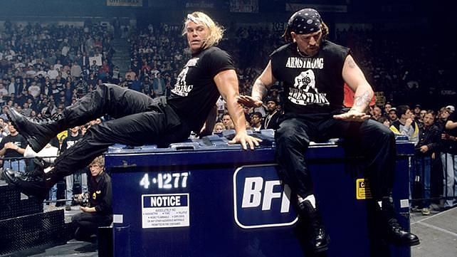 The most memorable and shocking moment of this feud came during a match between Foley and Funk where both men ended up in a giant dumpster. As the two hardcore legends helplessly lay there, Road Dogg and Billy Gunn came to ring side, secured the dumpster shut and proceed to throw it off the side of the stage.
