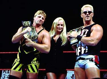 Palumbo and Gunn debuted late that year with matching bright red trunks, headbands, and bleach blonde locks, with constant insinuations that they were more than just tag team partners. Those insinuations only got broader with the addition of Rico to the entourage.