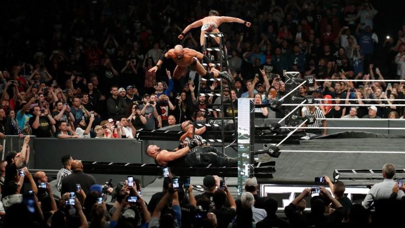 The highlights of this match were Ambrose and Rollins jumping from off the top of the ladders and driving Kane and Strowman through the announcement tables, Strowman driving Angle through a table with a Running Powerslam, Kane putting Strowman through a table via a Chokeslam, the trifecta of finishers from Angle & The Shield to The Miz, and the Triple Powerbomb to The Miz to win the match.