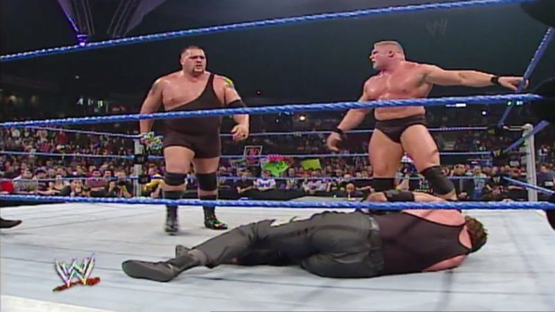 On the road to No Mercy 2003, two big matches on the PPV merged into a tag team bout on an episode of SmackDown. The hard-fought battle turned into a chaotic mess in the end, as Brock Lesnar prevented a three count after The Deadman hit a Chokeslam on John Cena.
