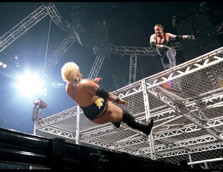 Foley took two serious bumps in the match - once when he fell from the top of the cell onto the Spanish announce table and the other was when he went through the cell owing to a Choke Slam from The Undertaker.