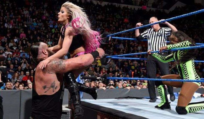 As Bliss was perched on the top rope to deliver a flying maneuver on Naomi, the latter hit a step-up enziguri to Bliss--sending The Goddess crashing into the arms of Strowman who fortunately happened to be outside the ring at the time. Strowman caught Bliss and what ensued was a moment of awkward silence on part of Team Little Big...Notwithstanding, the fans loved the spot, and in fact got to witness yet another similar spot wherein Naomi shoved Bliss off the ring apron right onto Strowman who was ringside.