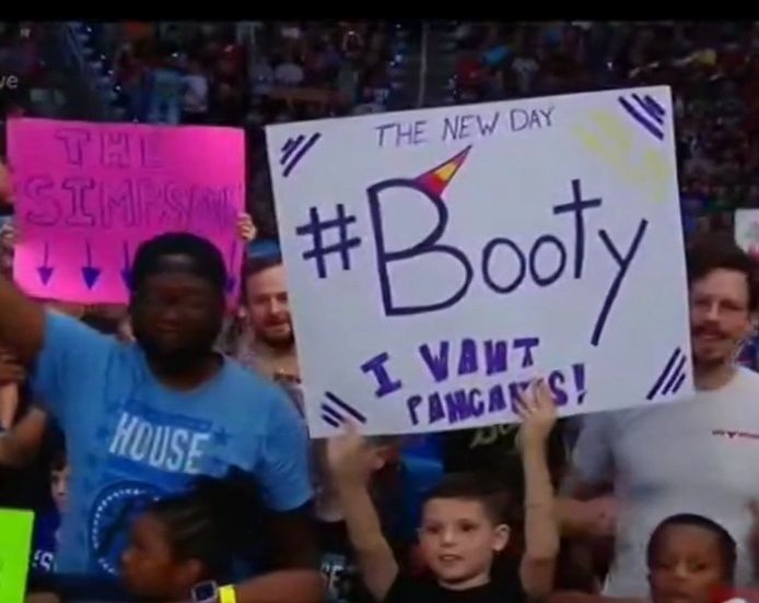 All that being said, the fan sign which stole the cake (or pancake) was that of a poster reading "The New Day #Booty I want pancakes." Before their match, it is customary for the New Day to spread the power of positivity by brimming pancakes on a fan's mouth and distributing it all over the WWE Universe.