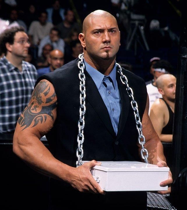 Debuting on main roster WWE in early 2002, Deacon Batista was partnered with mid-card comedy heel, Reverend D'Von and was instructed to carry around a church collections box and act as interference runner in D'Von's matches.