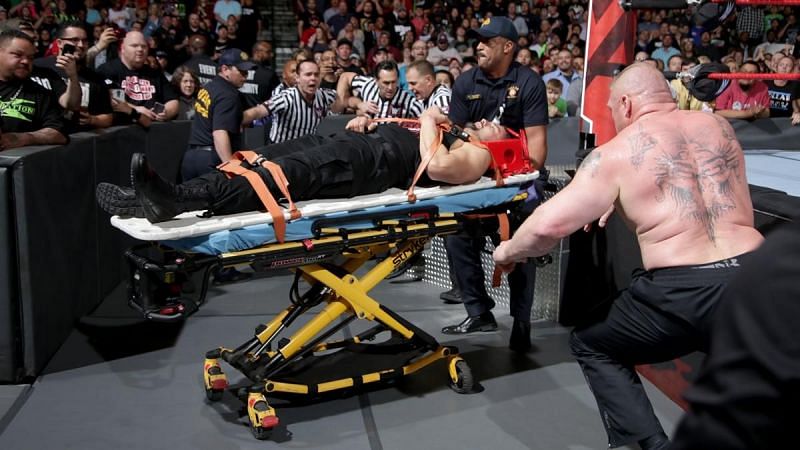 As Reigns was being led away on a stretcher, Lesnar's music hit as he came out to attack Lesnar again.