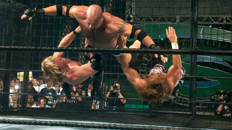 Summerslam 2003 hosted the second version of the WWE's Elimination Chamber match, and this one was star-studded with HHH, Jericho, Shawn Michaels, Randy Orton, Kevin Nash and Goldberg being the lineup, all sure-fire Hall of Famer's. Goldberg had joined WWE in March of 2003 and the likelihood of him tearing through the WWE roster as he did in WCW was high. HHH had other ideas however and after Goldberg had made his way through the rest of the participants in the Chamber Match, HHH laid out Goldberg with a sledgehammer shot to the forehead.