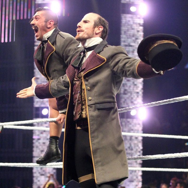 Meanwhile, Aiden English began his career playing up a hammy old school theatre gimmick as half of the Vaudevillains tag team with Simon Gotch. After Gotch left the company, English didn’t totally eschew his own personality, but rather leaned into the singing element of it as he transitioned to playing Rusev’s hype man.