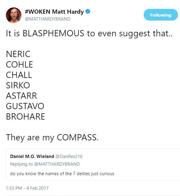 Matt Hardy called upon the Seven Deities which includes: Neric, Cohle, Chall, Sirko, Astarr, Gustavo, and Brohare. Although these deities were devised from the brain of Hardy and don't have any direct spiritual reference we can tell, they are still fitting names for the voices in Broken Matt's head who counsel him and understand, they talk to him.
