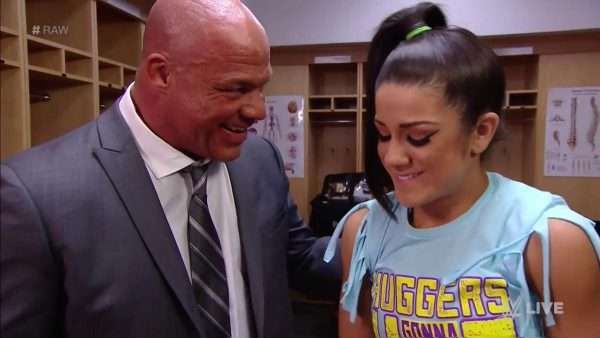 If her father did turn out to be Angle, then it could also be a good way to explain why she became much more childish since joining the main roster. What if her vulnerable, little girl gimmick was all a way to attract the attention of her daddy/GM? After all, we all remember that segment involving Bayley and Angle right before her match with Alexa Bliss at Extreme Rules. Something about that felt very paternal.