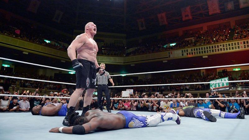 As soon as the closing bell rang, Bobby Lashley took to the ring and exploded with a couple of spears to the champions. He brought in a steel chair to attack the two faces of WWE but missed his mark and exited the ring. Immediately, Brock Lesnar's music played. The Beast teased cashing in, but the beaten Kingston and Rollins stood tall in the center of the ring, waiting for the Money in the Bank winner to try an attack.