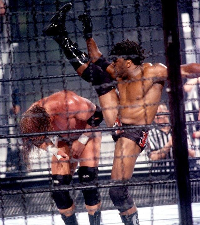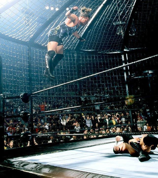 The grids of black steel chains that make the Chamber's walls add an extra "oomph" to the "throw to the cage" spots; Van Dam slams Trips into those grids repeatedly to get the red stuff flowing, then finds himself slingshotted into those same walls several times during a shocking (and short-lived) Jericho-Helmsley alliance.