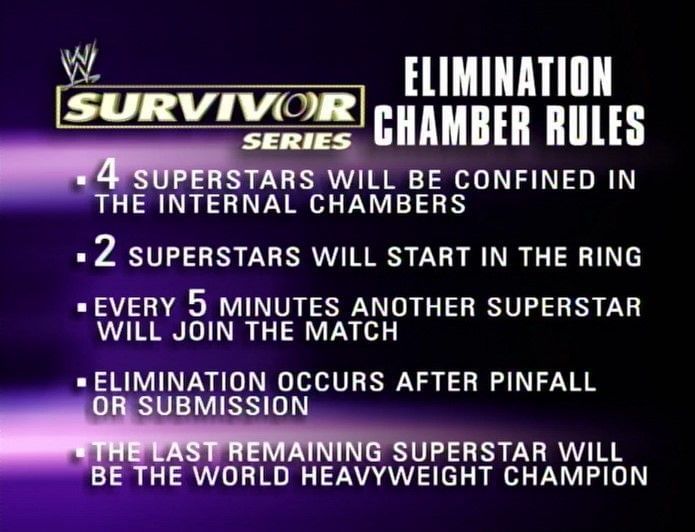 The Elimination Chamber belongs to the latter category of matches; when it debuted in 2002, it was WWE's first attempt to incorporate a wholly new structure since the birth of the Hell in a Cell cage and contest in October 1997.