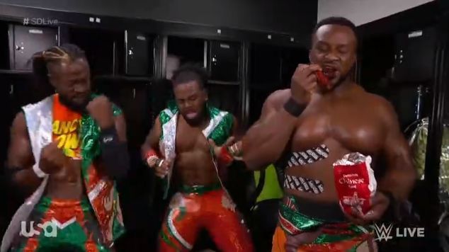 I just love how his fellow companions, Xavier and Kofi are concerned about Big E's taped ribs. But the only ribs that Big E seems to care about are the ones that go right into his mouth!