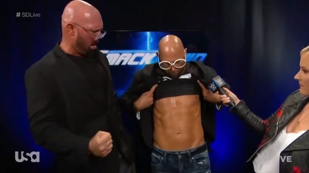But The Bar will face the winner of tonight's Tag Title Match: New Day vs. The Bludgeoned Brothers. But The Good Brothers- Luke Gallows and Karl Anderson have an issue with that. Gallows & Anderson pull off some quick comedy and Anderson even shows off his abs. You can see how Renee Young is taken aback out of nowhere in the picture above.