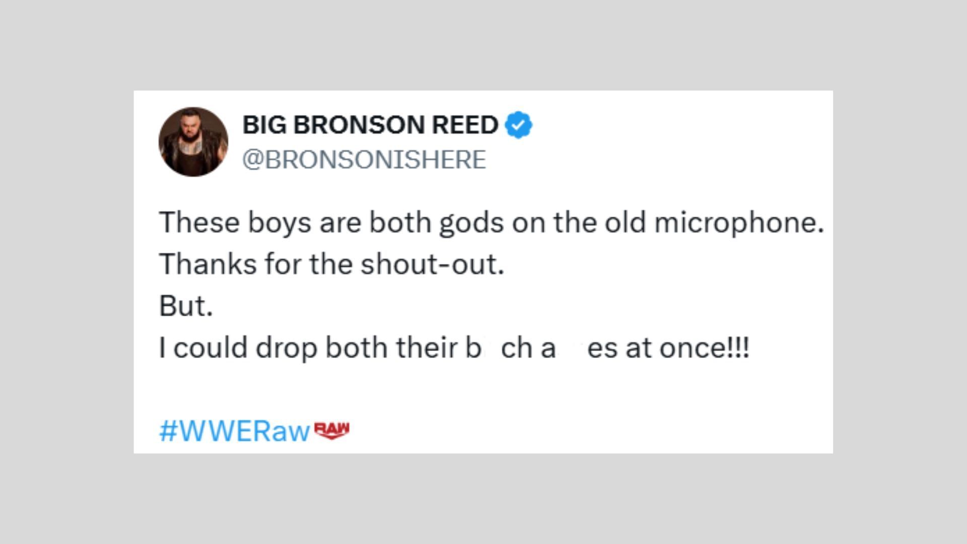 Taking to X/Twitter at the end of RAW, Bronson Reed praised Punk and Rollins on the microphone before changing his tone. He declared that he could drop both of them at once in a defiant message. Check it out HERE: