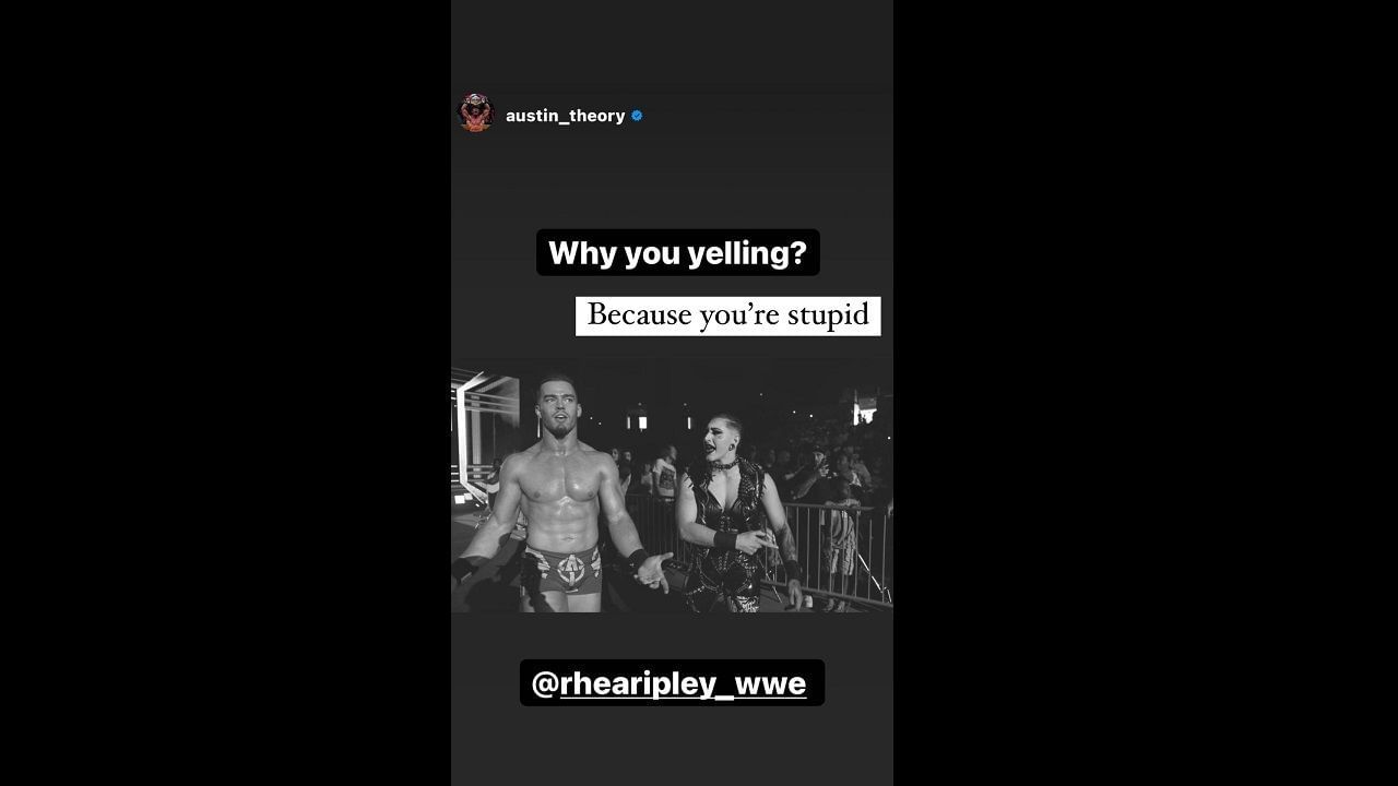 At the May 14, 2022 WWE live event in Florence, AJ Styles & Finn Balor defeated Damian Priest & Theory in tag team action. Theory later shared an amusing still from the event, in which The Nightmare can be seen yelling at him. Theory wrote the following in the caption to the picture: "Why you yelling?" Ripley responded to the picture on her Instagram story and bluntly stated: "Because you're stupid."