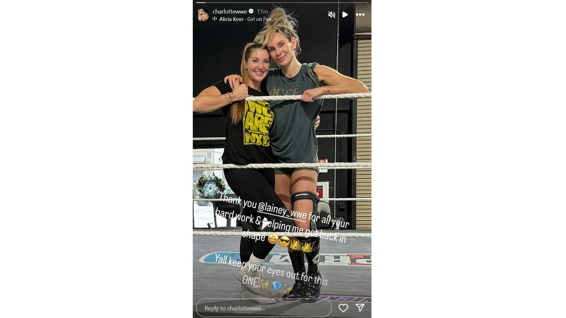 Flair is now back to training at the WWE Performance Center. The 17-time champion took to Instagram today and shared an in-ring photo from Orlando with NXT Superstar Lainey Reid. Charlotte thanked the 26-year-old for helping her get back to ring shape and then gave her a big endorsement. She also attached Alicia Keys' "Girl On Fire" single as the story theme song.