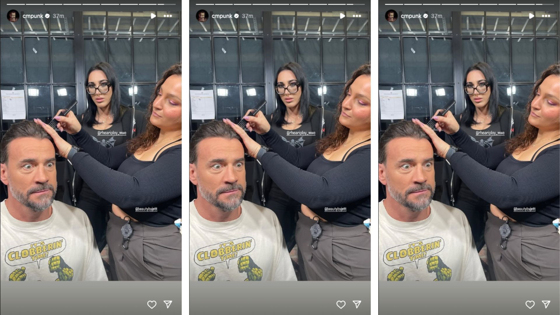 The Second City Saint took to his Instagram story ahead of tonight's episode of RAW to share a photo of himself and Rhea Ripley. Punk was getting his hair done by Jet Emini in the photo, with Ripley watching on in the background. The Best in the World and the Women's World Champion recreated a popular behind-the-scenes photo from the movie, The Shining.