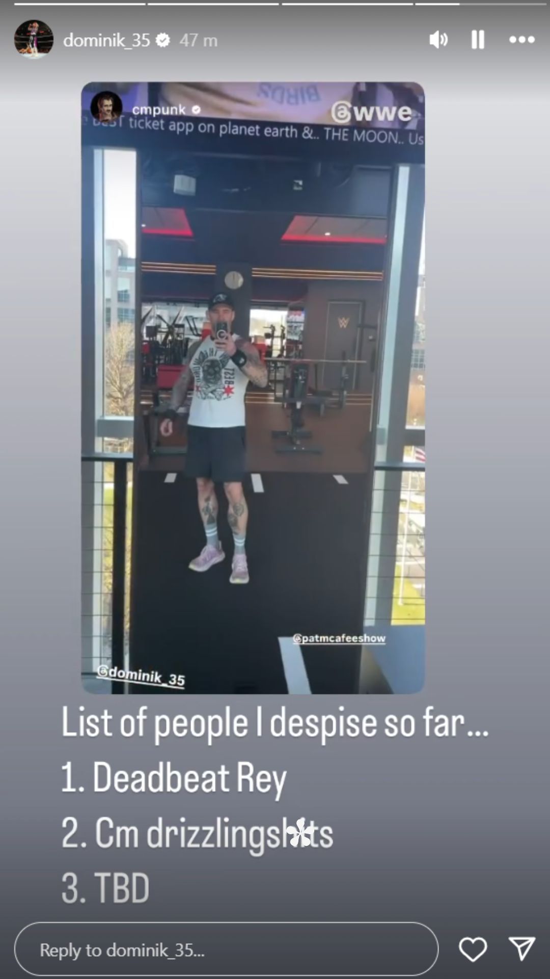 Earlier today, "Dirty" Dom reshared CM Punk's Instagram Story, in which the latter joked about the 27-year-old. The younger Mysterio noted that the veteran is the only person other than The Master of the 619 that he despises. He further referred to Punk as "CM drizzlingsh*ts."