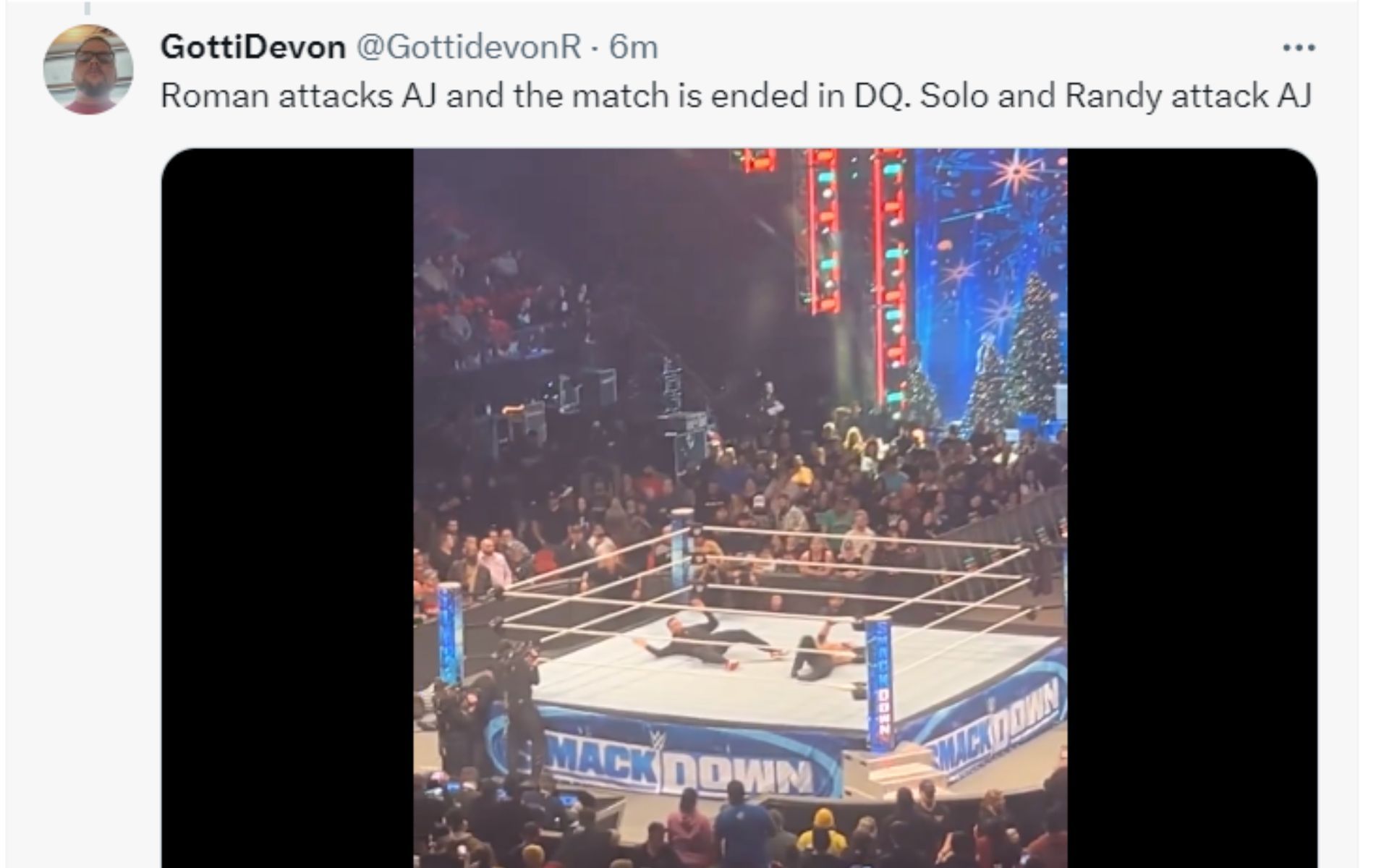 The match ended in a Disqualification finish as Roman Reigns attacked AJ Styles during his match against Solo Sikoa.