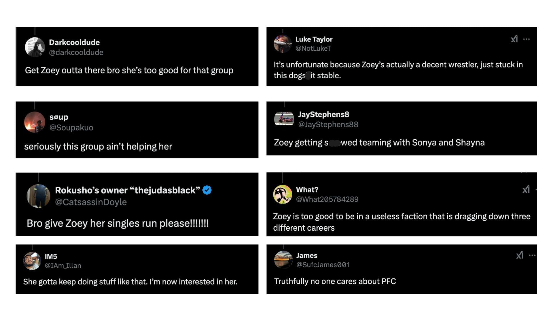 Despite the impressive display from the 30-year-old female star, Pure Fusion Collective failed to emerge victorious. On X (formerly Twitter), fans wrote that Zoey Stark should depart from P.F.C. Many believed that Stark was too talented for the group and that aligning with Shayna Baszler and Sonya Deville could hinder her potential as a singles competitor in WWE.
